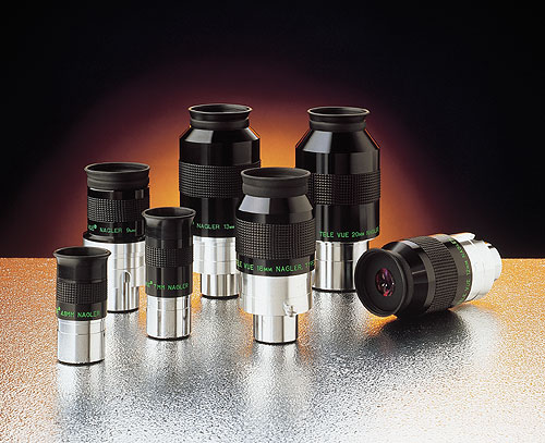 | Durch das große Gesichtsfeld der Nagler- oder Widefield-Okulare ist die Staffelung der verschiedenen Okulare nach Brennweite nicht unbedingt richtig. Mit 2000 mm Brennweite sehen Sie mit einem 9 mm Nagler ein 0,37° großes Stück Himmel in 227-facher Vergrößerung, mit einem 15 mm Plössl 0,39° in 133-facher Vergrößerung. In beiden Okularen sehen Sie also praktisch das gleiche Bild, nur eben im Plössl wesentlich kleiner. | TeleVue Nagler (größeres Bild, 58 KB) |
